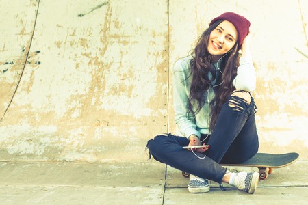 屋外のスケート ボードと内気なスケートボーダー少女 使用して 携帯電話 音楽に耳を傾けます ヘッドフォン 街で Skatebord クールな面白い Tenager ハーフパイプ 夏のスケート ボード 女子高生 の写真素材 画像素材 Image